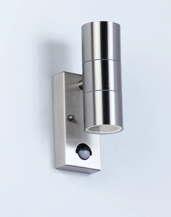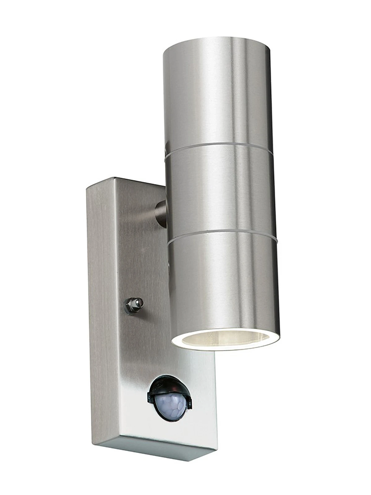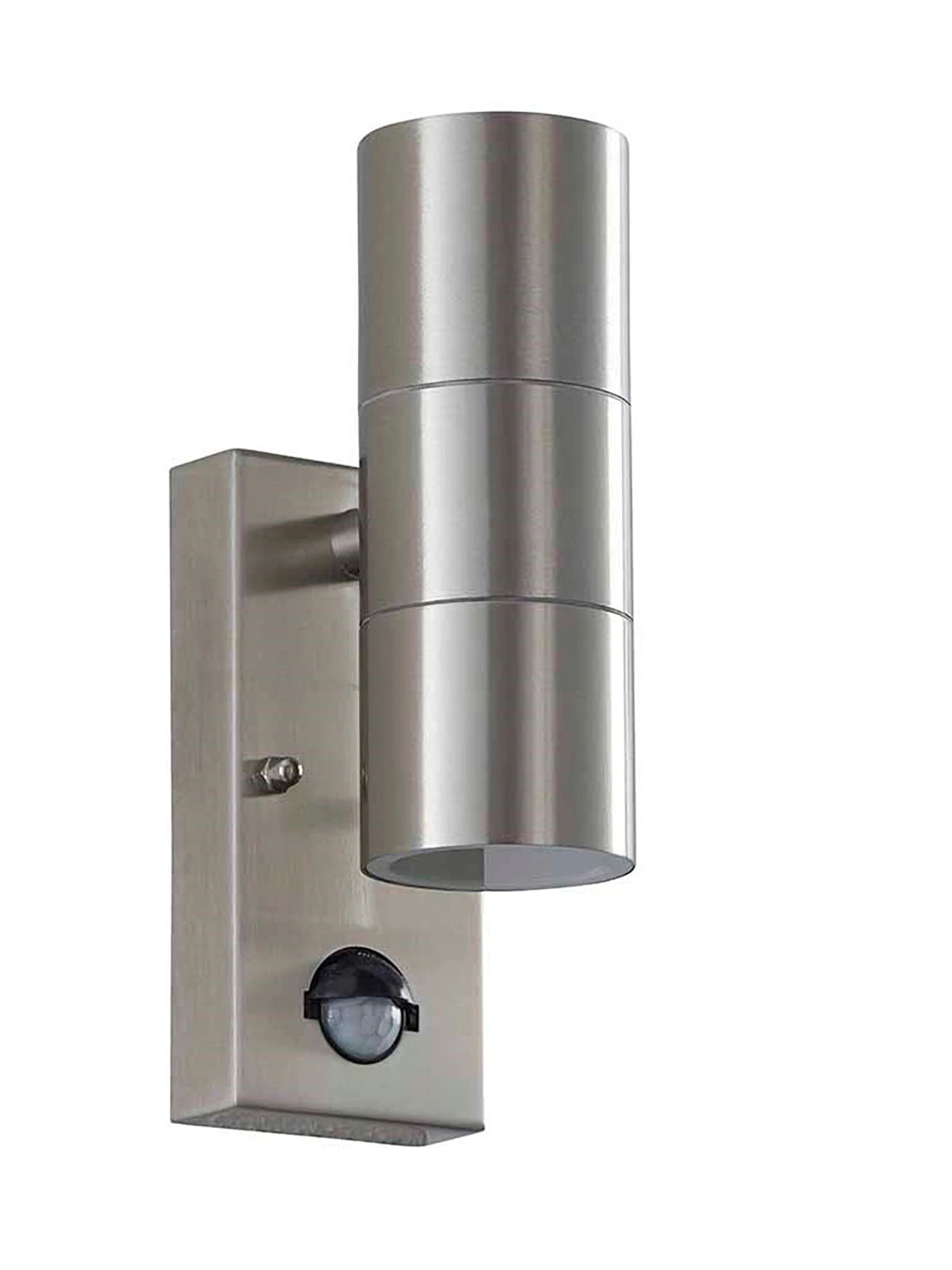 Canon Up/Down 240v – Polished Stainless Steel IP44 2 x GU10 Security Wall Light With PIR Sensor