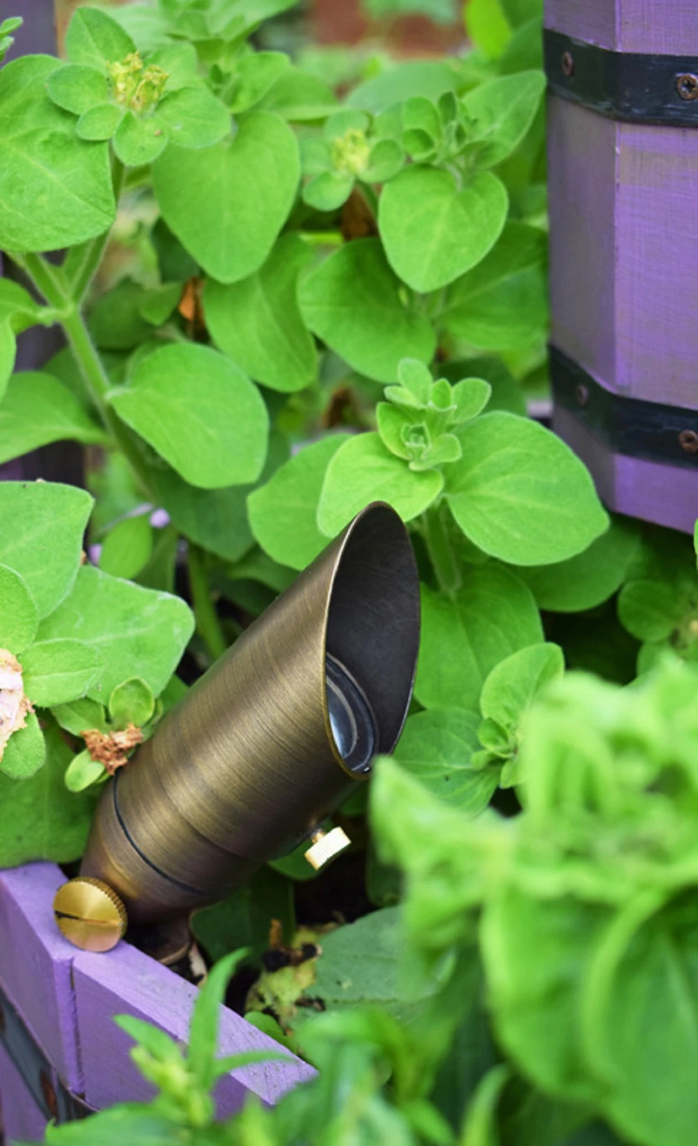 The 12v Minilite is a mini garden spotlight in solid brass with a decorative rustic bronze finish. An extra durable polycarbonate