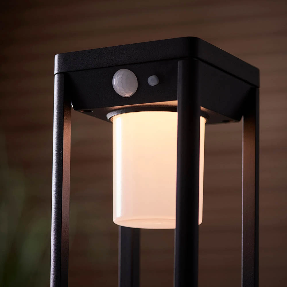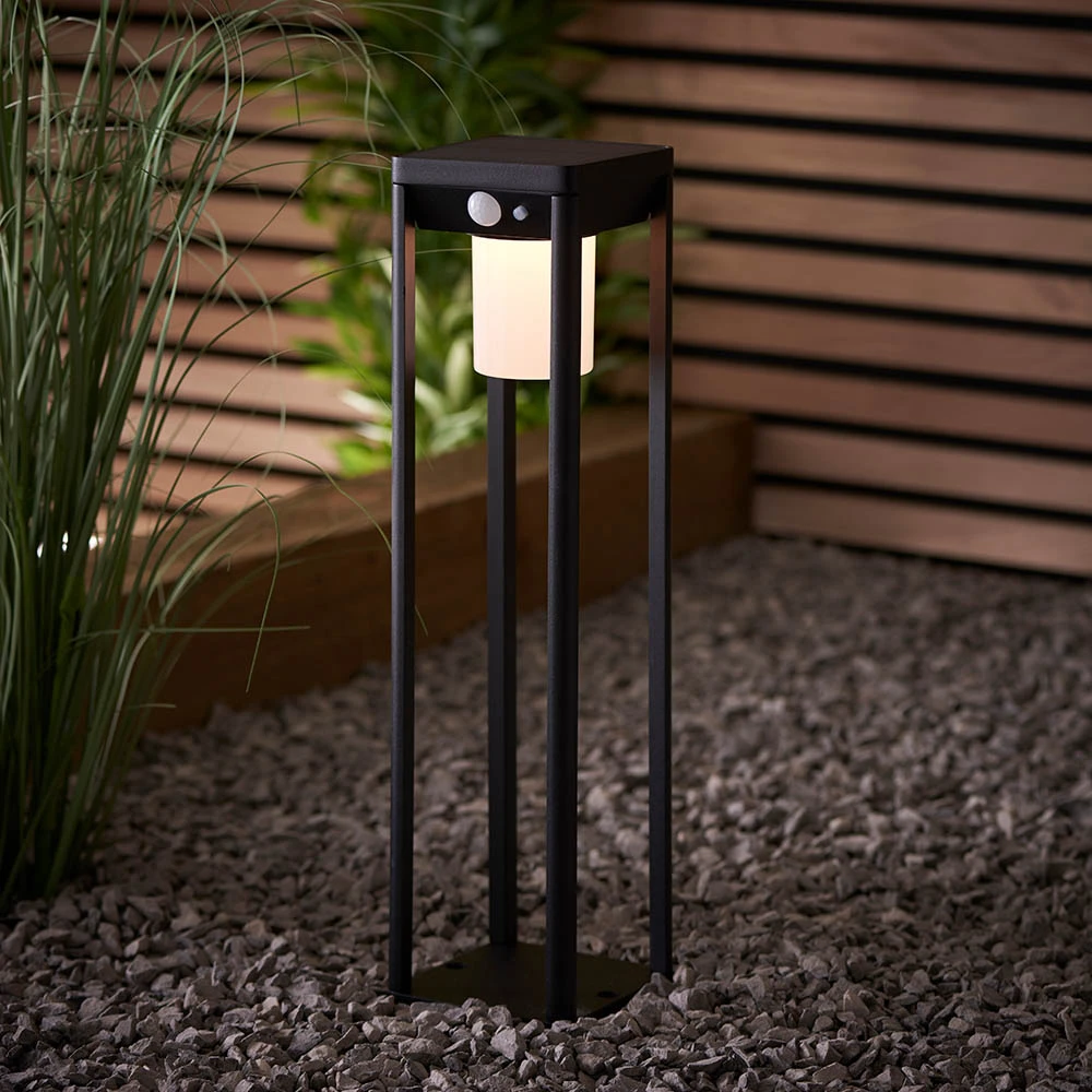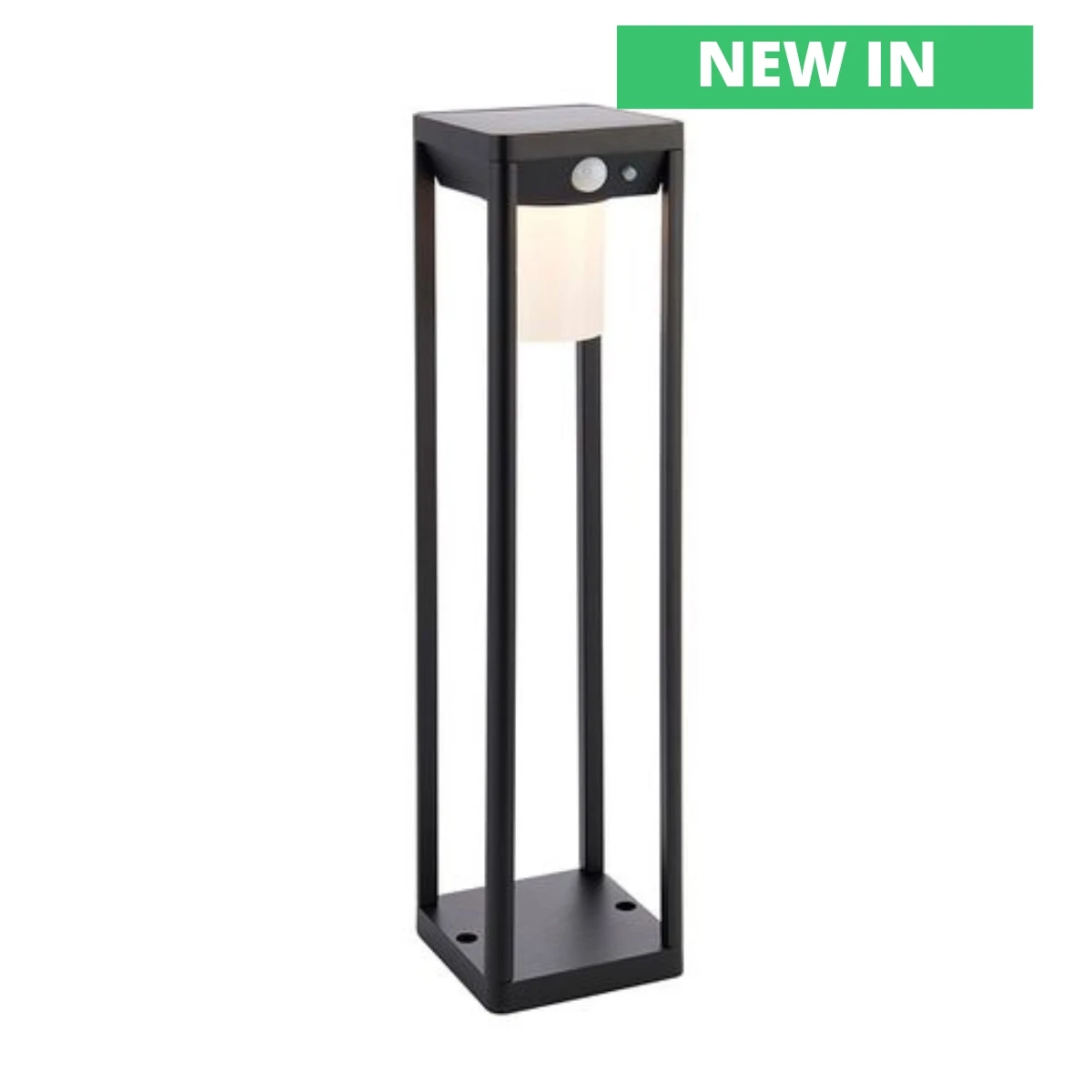 Save on energy bills without compromising on style. Modern design solar powered bollard light with Black Powder Coates Aluminium and white pc diffuser. PIR sensor to help light the way – 110 degrees detection angle and 8m maximum range.