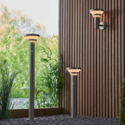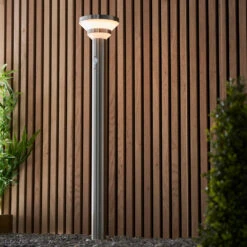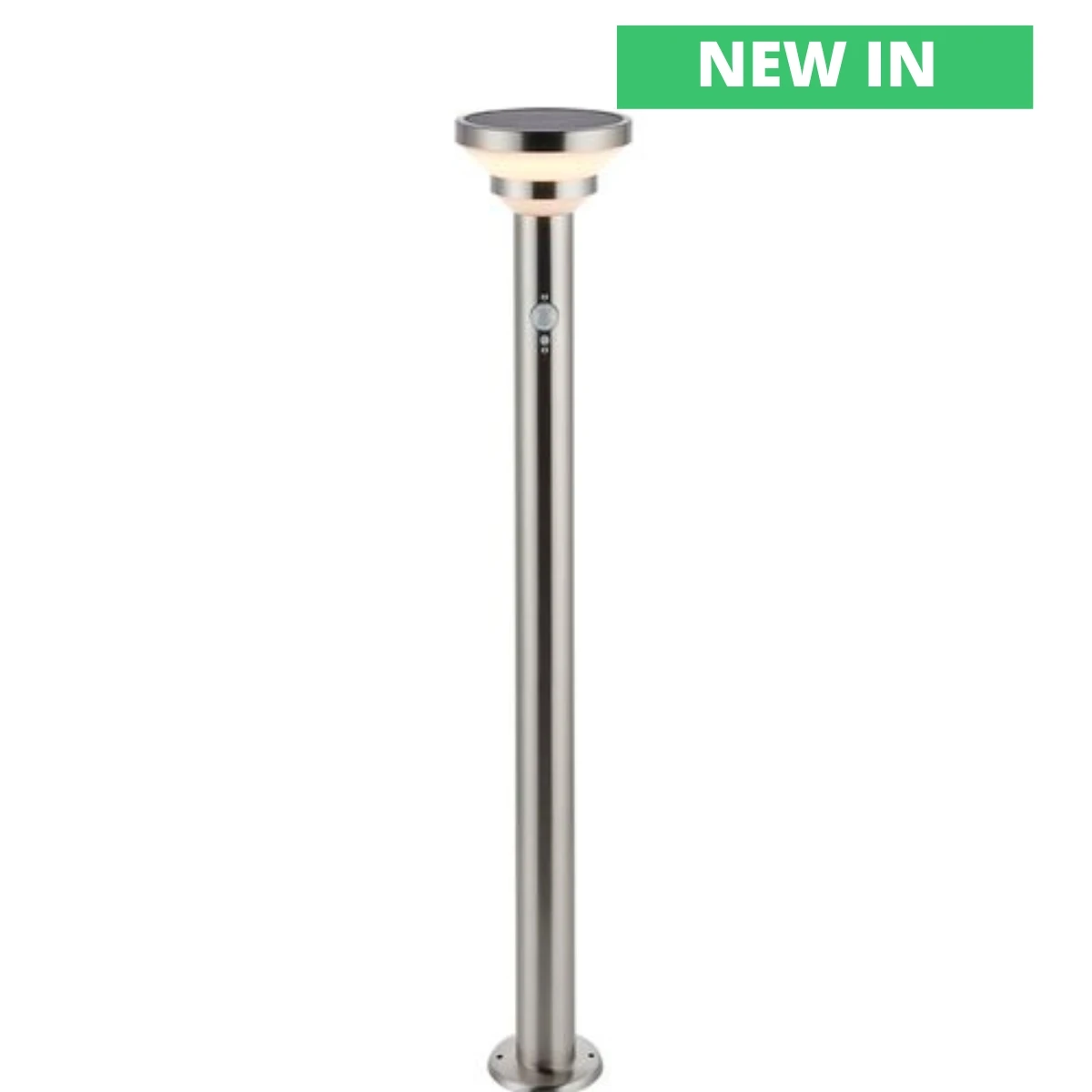 Save on energy bills without compromising on style. Modern design solar powered bollard light with brushed stainless steel ad white pc diffuser. PIR sensor to help light the way – 110 degrees detection angle and 8m maximum range.