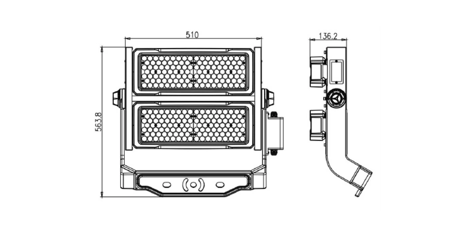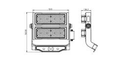 Dimensions of the 500w LED flood are Width 510mm x Height 563.8mm x Depth 136.2mm Weight 19.5Kg.