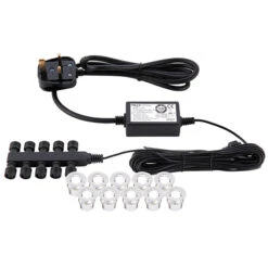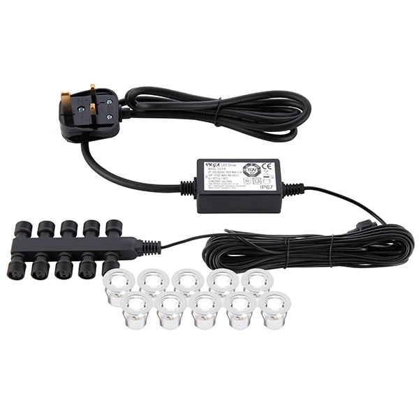 - Kit includes: 1 x 12V IP67 inline transformer with 10 metres of cable, 1 x Outdoor rated 10-way junction