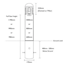 the standard tubular body and mounting base, the root mount bollards have longer bodies. At least 400mm secures / concretes in place without