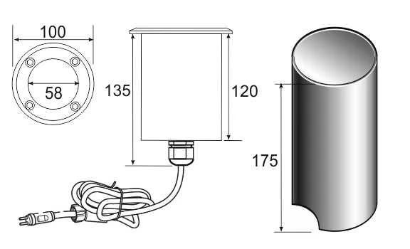 cable connector. Spring clip locates in a 85-95mm hole drilled in decking and paving or the plastic mounting sleeve supplied