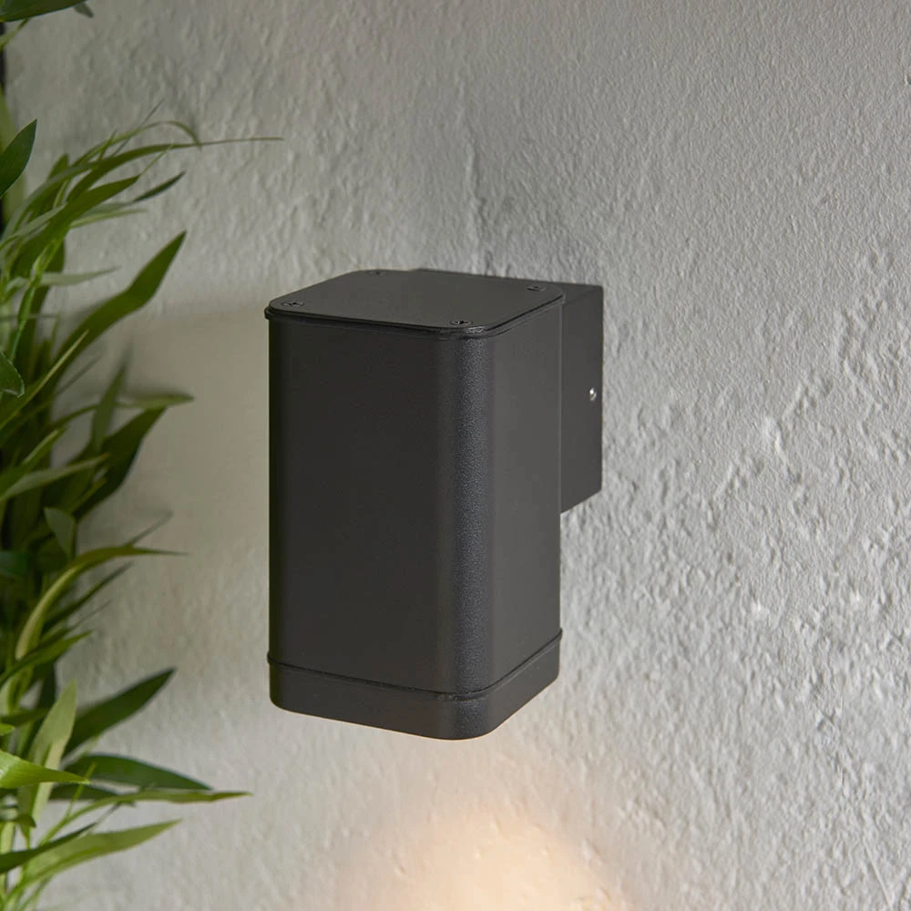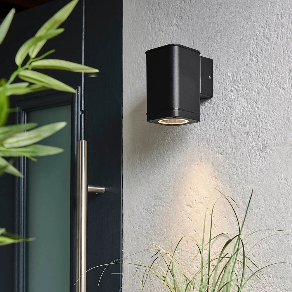Light up the outside of your home with this modern architectural style wall light. Textured black finished metalwork and clear glass diffuser. Corrosive resistant aluminium construction to endure weather conditions. This item is dimmable. Also available in an up/down light.