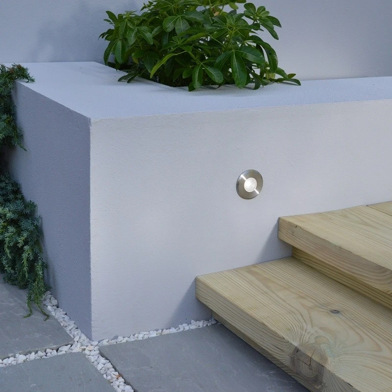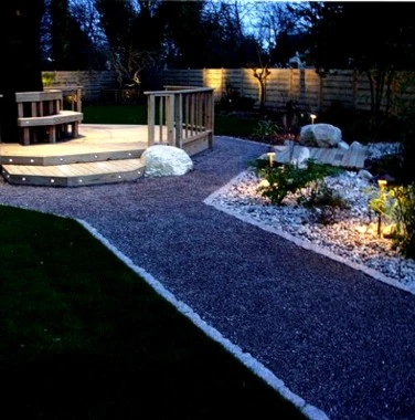 distinctive shape, start at the corners of the decking or paving and space LED recessed garden lights at about 60cm – 1m
