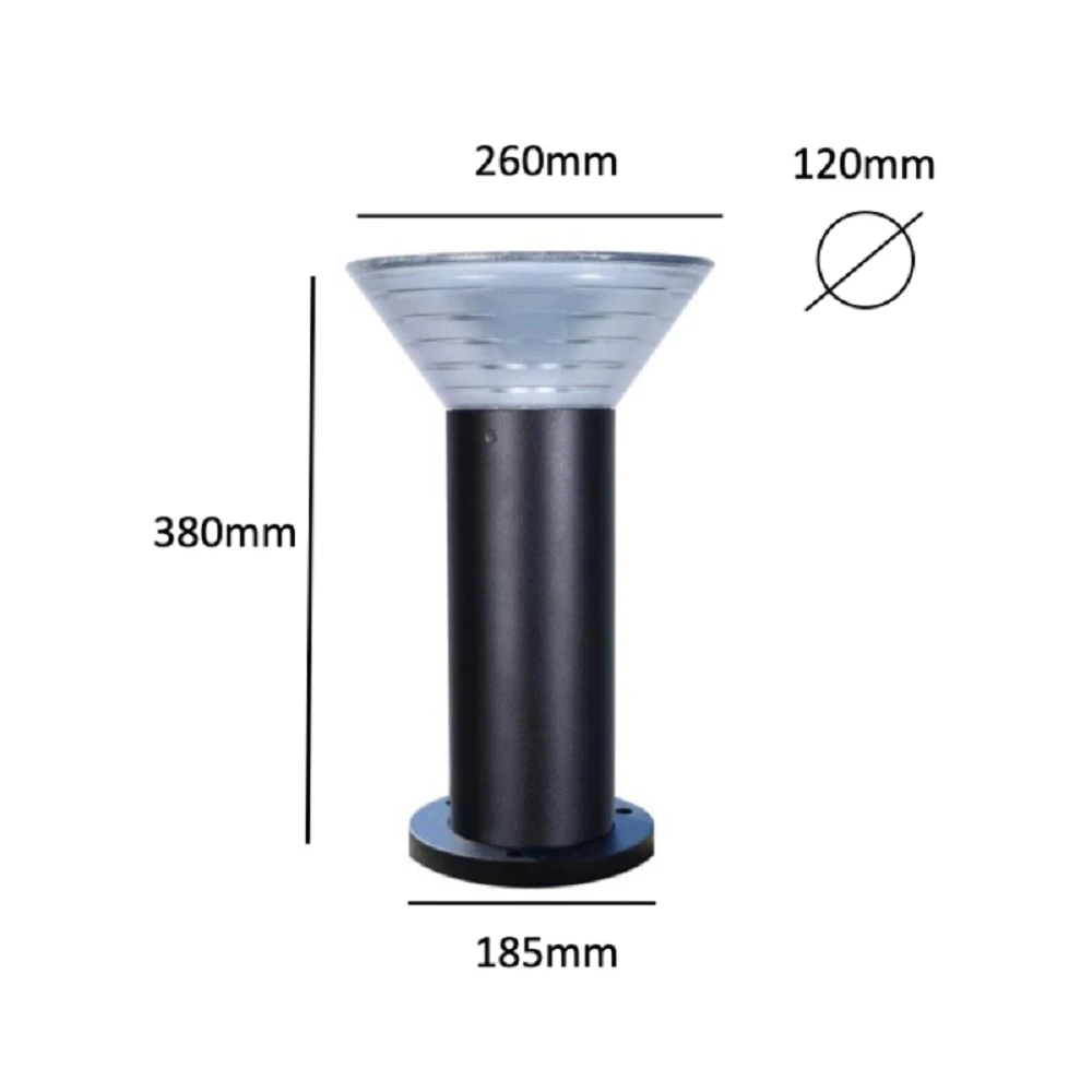 Dimensions Height = 380mm Post diameter = 120mm Frosted Lens Diameter at top = 260mm, Base Diameter = 185mm