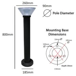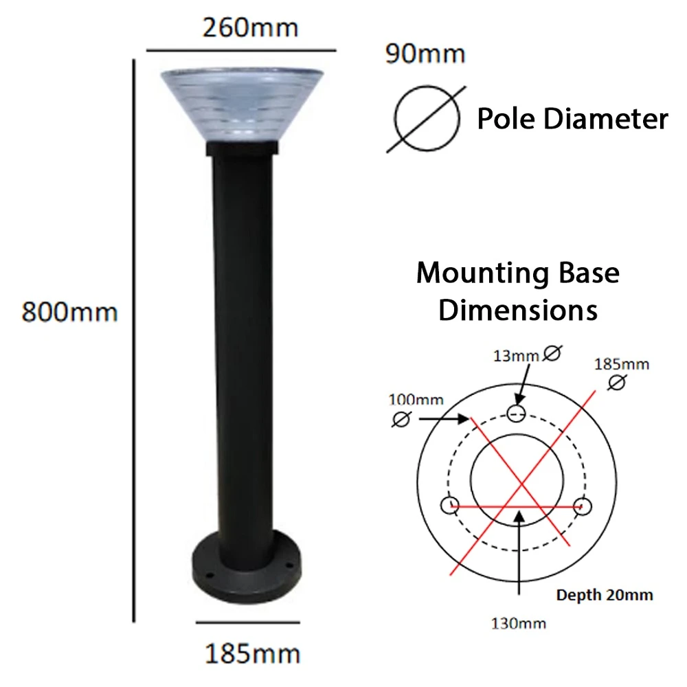 - Dimensions – Height = 800mm, Post Diameter = 90mm, Frosted Lens Diameter at top = 260mm, Base Diameter 185mm