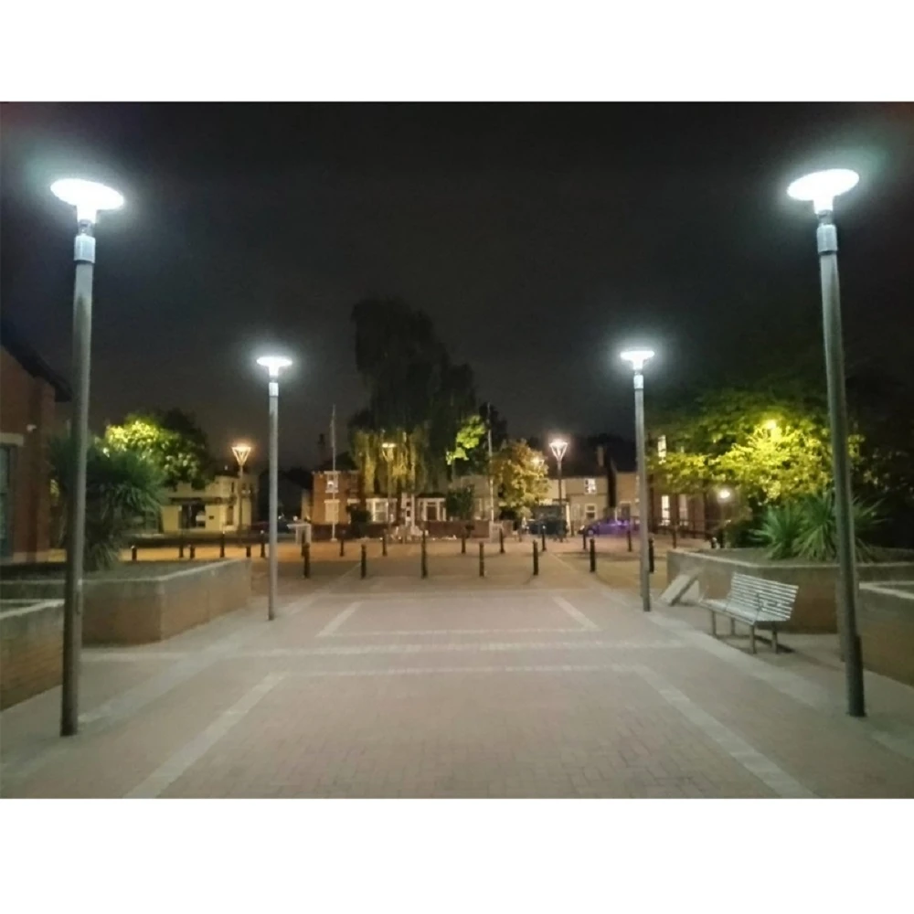 The Streetmaster Solar LED Street Light shape is designed to emit all light downwards, 360 degrees. This prevents light pollution. It has a more slimline appearance than other solar street lights such as the Olympia Max. Rated IP65, the durable, die-cast aluminium housing has a black finish to blend in with standard black poles. Paired with the UV-stop polycarbonate lamp cover, the Streetmaster will likely withstand vandalism and accidental damage in a wide range of public spaces.
