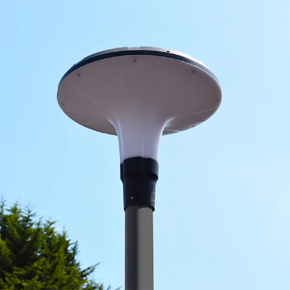 The Streetmaster solar LED street light has a large yet discrete, integrated 20w solar panel located on top of the shade. The battery and LEDs are concealed inside the white polycarbonate diffuser. Using highly efficient 2700lm Osram LEDs, the luminaire distributes an even 360° spread of light.
