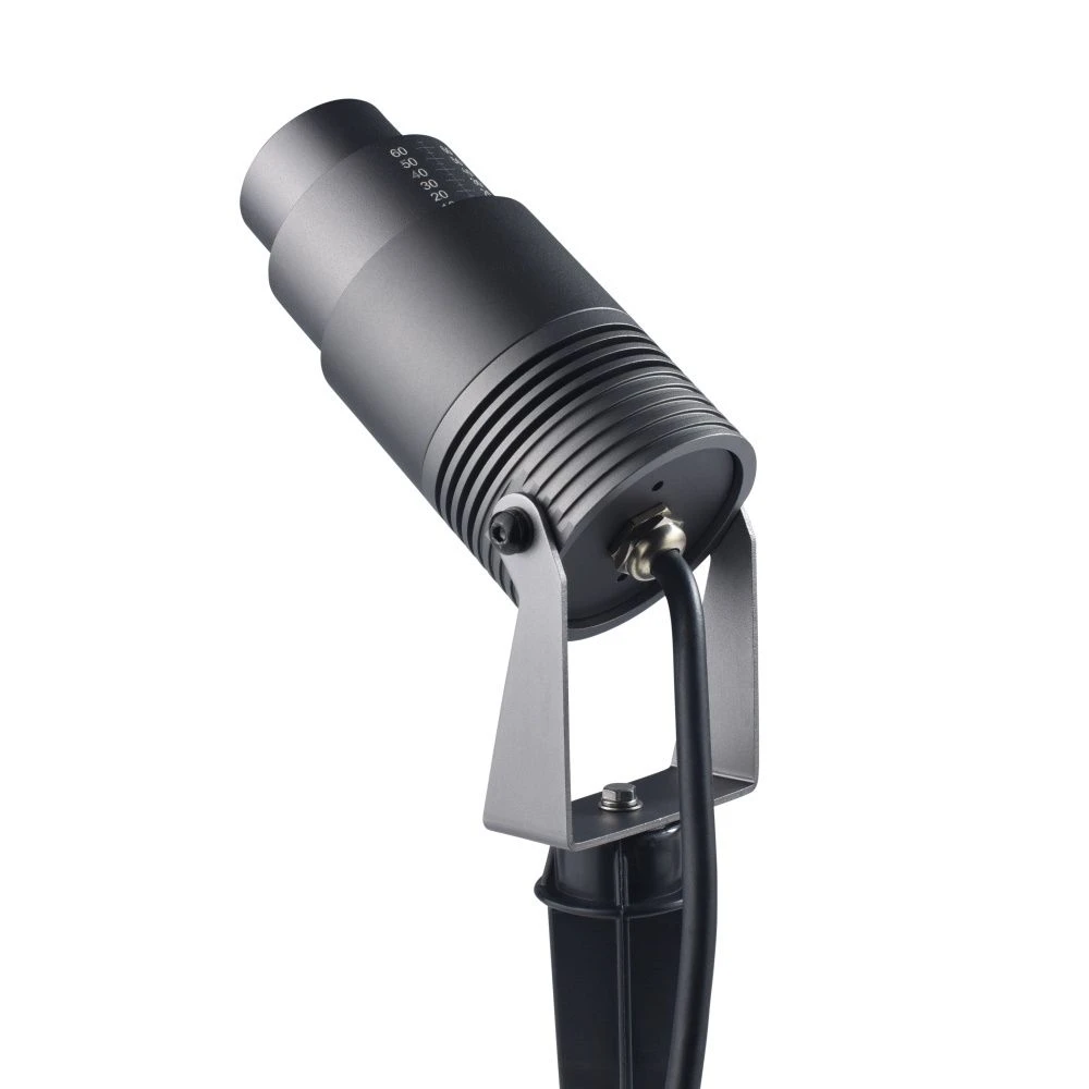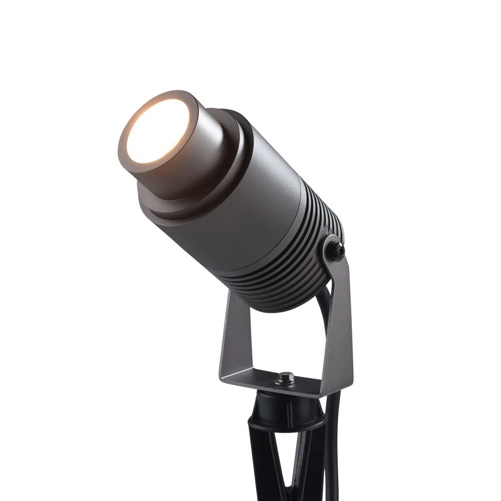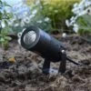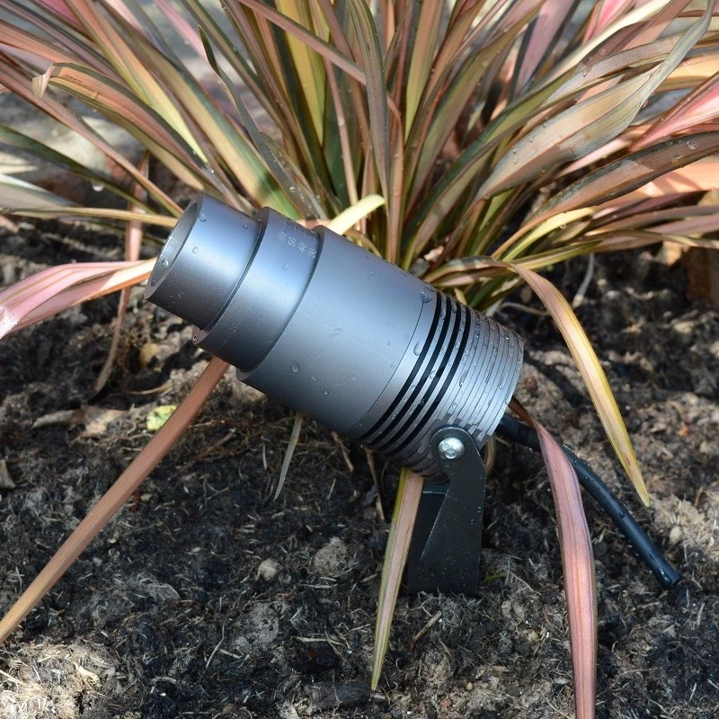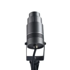 Unibeam is an adjustable spike-mount 240v LED outdoor spotlight with a telescopic glare shield, for focusing the beam angle