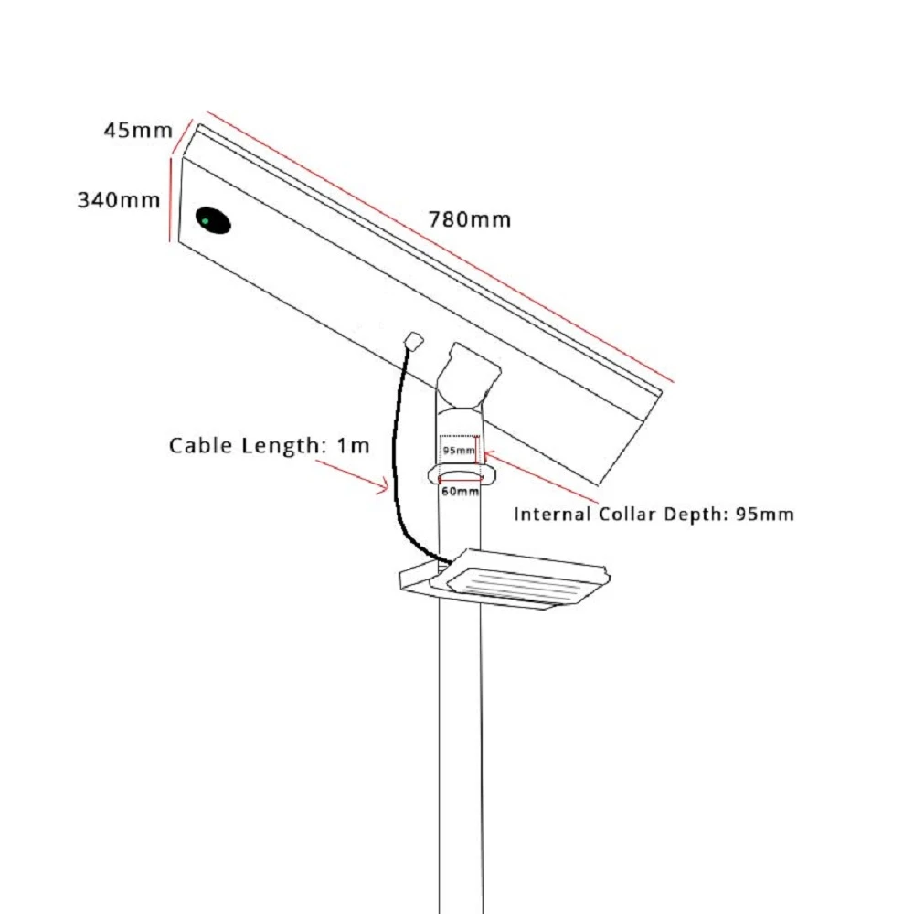 IP Rating – IP65, Lumen output 2400 Lumens, Collar Size 60mm, Pole Mount Depth – 95 – 100mm, Wattage 15w, Working time – Up to 5 nights.