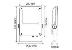 Dimensions of the 100w LED flood are Width 285.1mm x Height 406.3mm x Depth 61mm Weight 4.0Kg.