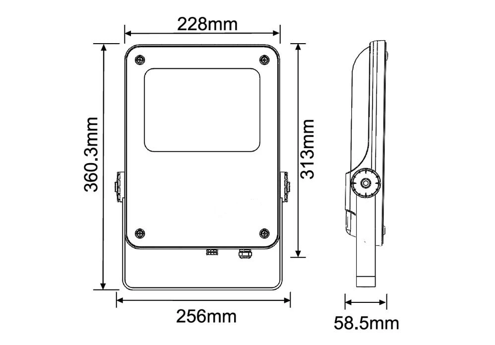 Dimensions of the 50w LED flood are Width 256mm x Height 360.3mm x Depth 58.5mm Weight 3.5Kg.